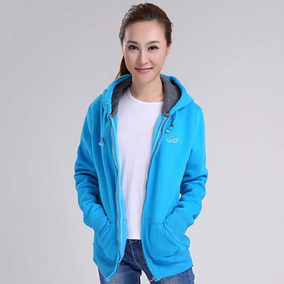 產品款式:藍色貼兜連帽開衫女裝衛衣