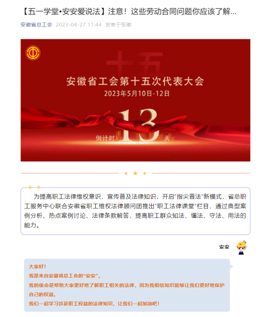 同時在五一期間組織開展了以“慶五一,學法律”為主題的相關培訓活動。積極鼓勵員工參與安徽省總工會以及合肥工會組織的各類五一勞動節線上線下活動,這些活動涉及了雇主責任險、勞動安全保護、女職工保護、工會勞動法律知識等關乎職工切身利益的多方面知識,也得到了企業職工的熱烈響應。