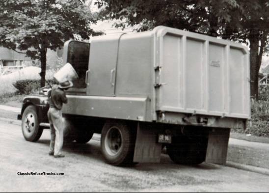 7、除此之外,當(dāng)時還有一種受歡迎的垃圾車,叫側(cè)裝卸垃式圾車。這種垃圾車是在1947 年早期由帕克摩爾制造的。它由一種耐用的圓柱形垃圾收集單元組成。垃圾被投擲到箱體一邊的開口里。一個液壓油缸或壓盤將推擠垃圾往箱體的后方。一旦充實,液壓油缸或壓盤充當(dāng)噴射器,允許垃圾水平地拋出(這一產(chǎn)業(yè)中的另一個創(chuàng)新) 。這種垃圾車不能處理龐大的垃圾,但是卻大大節(jié)省了人力勞動。